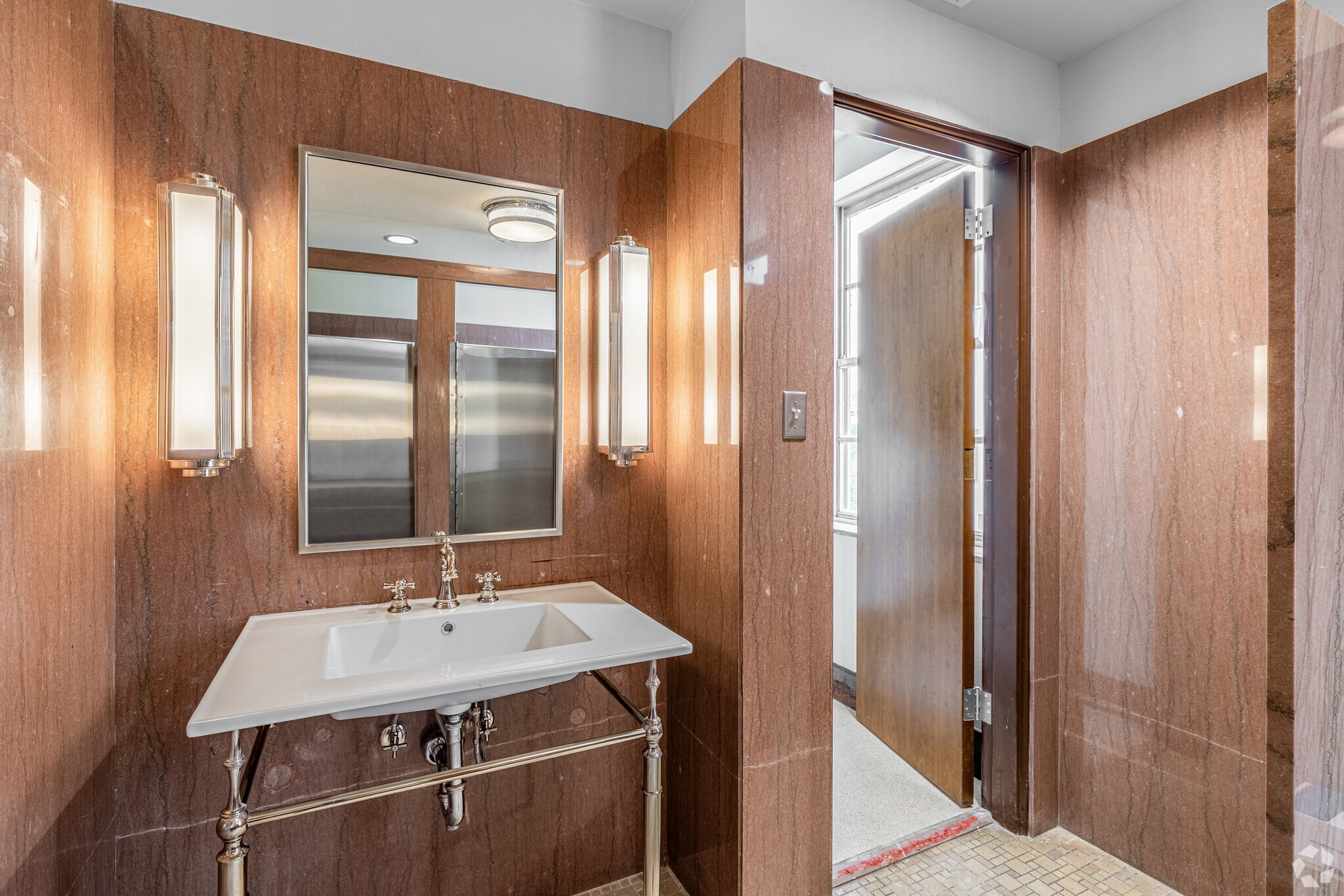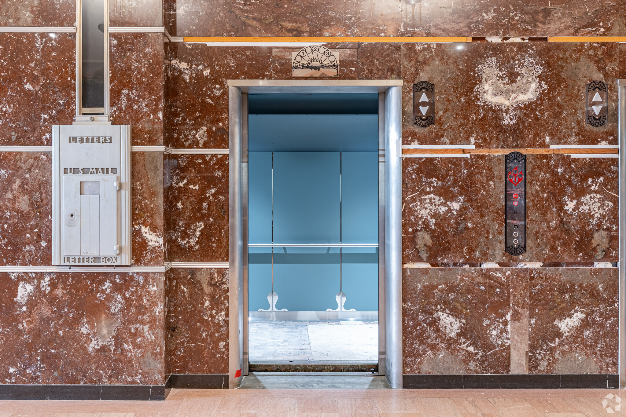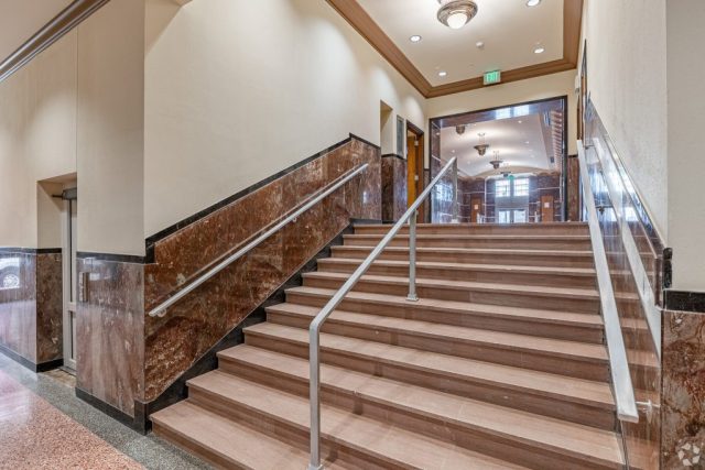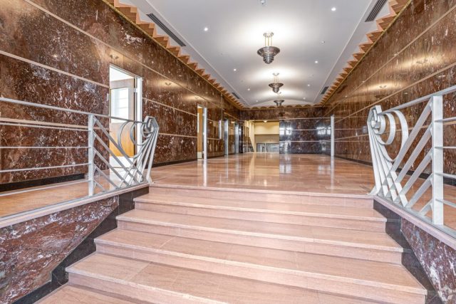 The interior tenant spaces will be built out within the building as tenants are leased into Class A office spaces. A suite of offices on the north third of the second floor retained the original wood paneling and soffits. While water damaged, we were able to rehabilitate the surfaces back to their original luster, preserving a meaningful series of spaces for future tenants. The Auditorium has been upgraded to feature new digital audio and video presentation systems including a large video wall to allow for many options for training and presentations.